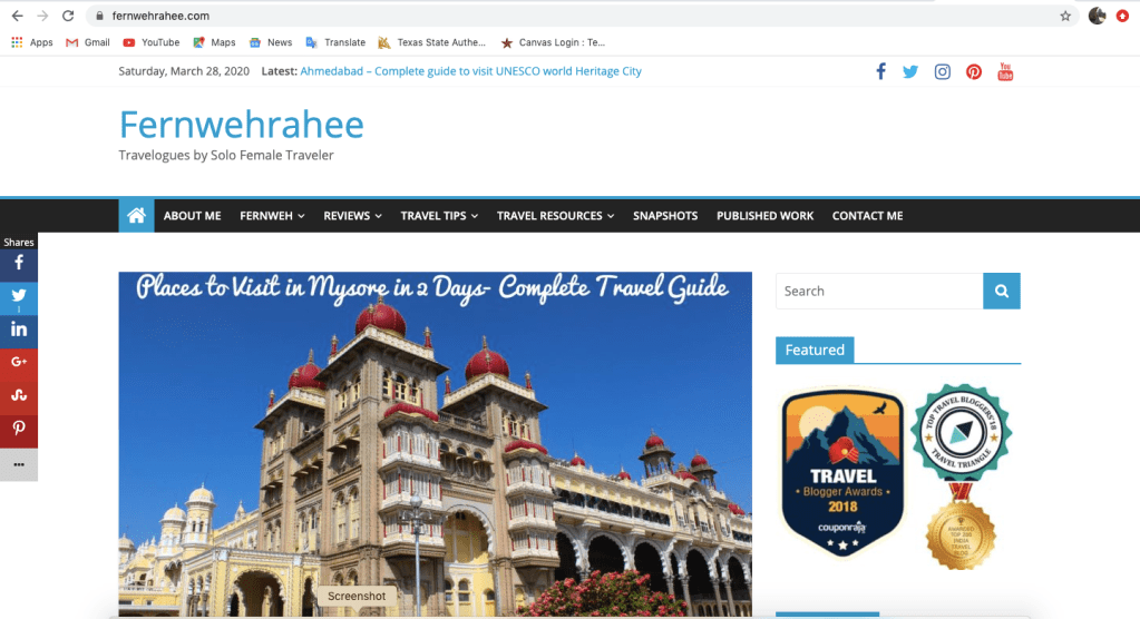 Fernwehrahee is an amazing blog by solo female traveler, Mayuri Patel. Just as unique as the name of the blog is, the meaning is also special. In the‘About me’ section, Mayuri explains that this name is formed with the compilation of two different words from two different languages. In other words, ‘fernweh’ is a German word which means someone who is sick of being at home for a long time (exactly what I am feeling right now while practicing social distancing through this period of coronavirus outbreak). Anyways, the other part of the word is ‘rahee’ which means traveler in Hindi.